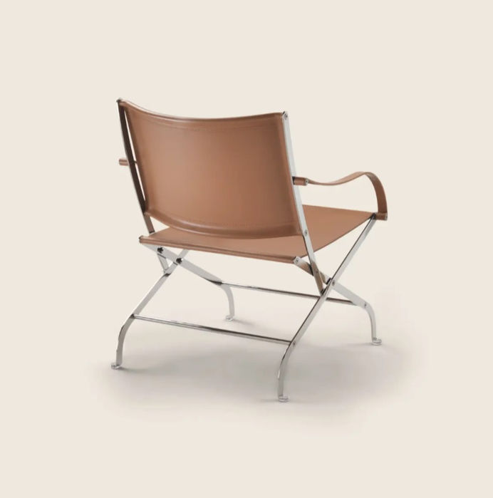 The archetypical folding chair, Carlotta was reinterpreted in a contemporary vein with a light hand and a pitch-perfect marriage of sophisticated materials, like metal and cowhide. The joint screws, clearly visible on the metal structure, emphasize the austere, unornamented design that sets this armchair apart. It comes in an array of finshings. The seat, seat back and arm rests are upholstered in cowhide, in all the colors available in the Flexform collection palette. The Carlotta small armchair can be paired with its namesake folding footstool.
