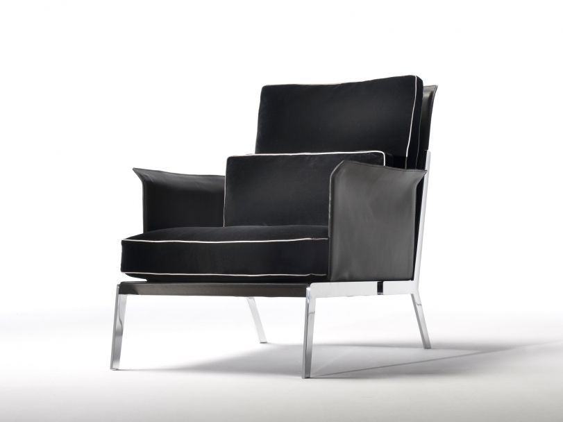 Happy-hour is an armchair whose clean, uncluttered lines express refined elegance through the choice of material: luxurious, pliable cowhide. The metal seat back and armrest structure is entirely upholstered in cowhide, while the elegant base is made of metal in an array of sophisticated finishes. Countless combinations can be achieved by pairing the cowhide structure with the soft seat and seat back cushions upholstered in any of the fabrics and leathers from the extensive Flexform collection.