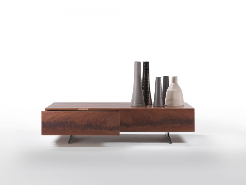 The Piuma collection of cabinets is a delightful marriage of understated elegance-of-form and the dramatic expressiveness of wood. In contrast to the deliberate simplicity of the design is the choice of veneers – crafted with exotic, rare woods, available in a number of shades. Free of handles, the finger pull is cut directly into the structure. A 45° mitered edge on the door/drawer serves as a finger grip, accentuating the clean, smooth lines of these cabinets that can be included in any setting and easily paired with all the tables, chairs, sofas and armchairs in the Flexform collection. Piuma cabinets are available in many configurations, both vertical and horizontal – credenzas with doors and drawers, hutches and sideboards, TV entertainment centers and small tables with drawers. Flawlessly finished, even on the back, these pieces also make a stunning statement when placed in the center of a room.