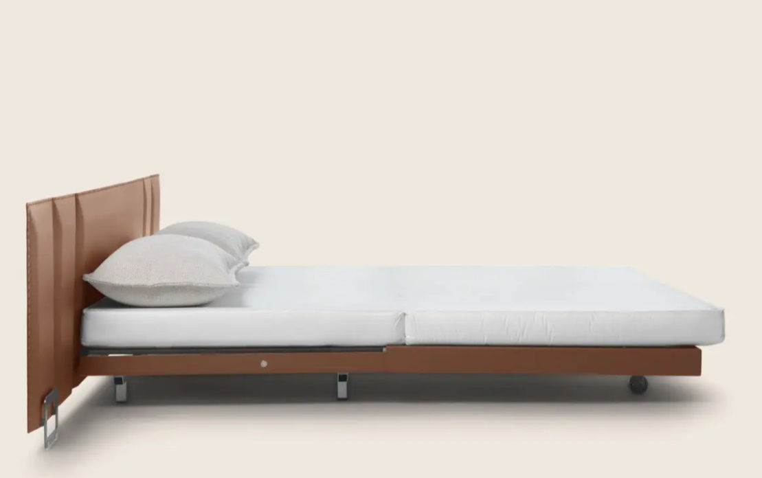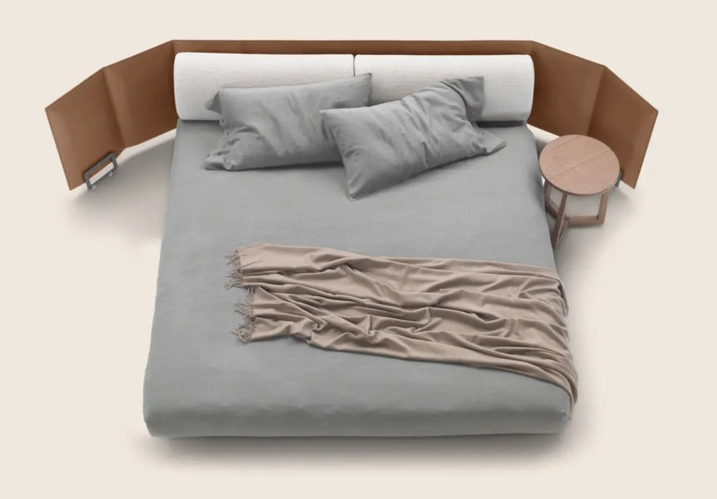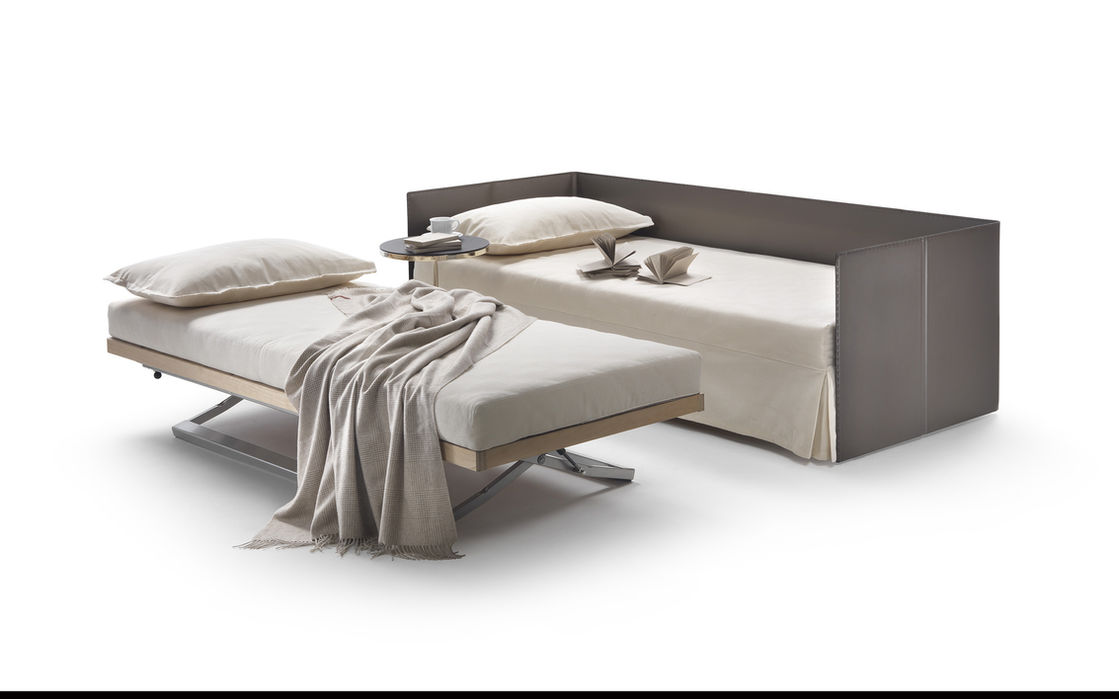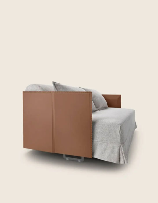 Eden is an elegant sofa bed available in single, queen and two single-bed versions. It features clean lines and masterful craftsmanship, enhanced by the use of a handsomely luxurious material like cowhide, singularly able to imbue any object with tangible added value, impervious to the effects of time and fleeting fashions. The seat back and armrests are made of wood clad entirely in cowhide and substantial bolsters padded with polyurethane and Dacron and soft goose-down-filled cushions. The base is upholstered with a tasteful slipcover in an easy-to-remove soft lightweight fabric. Kick pleats at the corners lend an added layer of sophistication.