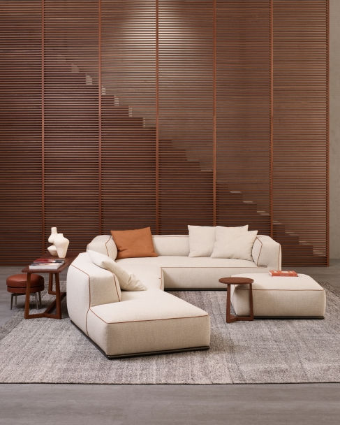 The variety of available modules – stand-alone, L-shaped and asymmetrical seating elements, ottomans and chaise longues, cowhide-clad storage, and wood coffee tables – allow for the creation of a great number of arrangements: from more compact stand-alone versions, ideal for face-to-face placement, to larger, more complex solutions, designed to enliven a distinctly contemporary domestic landscape.