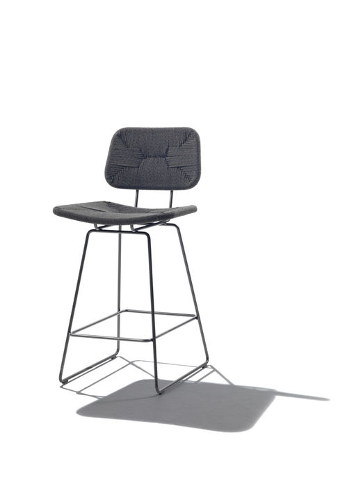The design concept is based on a bold material contrast: the structure is in sleek stainless steel while the seat and backrest are made of fine woven matt polypropylene cord in an elegant palette of colors.