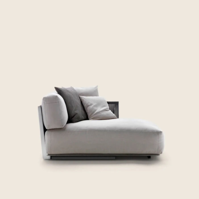 Woven materials, especially dear to Flexform, have inspired many products in the indoor collection, and weaving is now the motif featured in the Vulcano seating system. Concepts like compositional flexibility and a high degree of customization, coupled with a determination to find just the right materials to ensure optimum outdoor performance, are the core features of the Vulcano chaise longue design. The base is made of marine plywood, while the structure is in 316 austenitic stainless steel, a super alloy that ensures superior performance in outdoor settings, and is clad in elegant woven upholstery made of polypropylene fiber or polyurethane rubber, available in a sophisticated palette of colors. The chaise longue rests on a perimeter frame in 316 austenitic stainless steel and nylon pads. To ensure optimal outdoor performance, all the upholstered cushions are encased in a special lining material made of breathable water-repellent fabric, while the vast collection of outdoor upholstery fabrics guarantees excellent resistance not only to the effects of weather and the sun but also to chlorine and salt water. Use of their respective covers to keep the product in top condition and maintain its original appearance as long as possible is highly recommended.